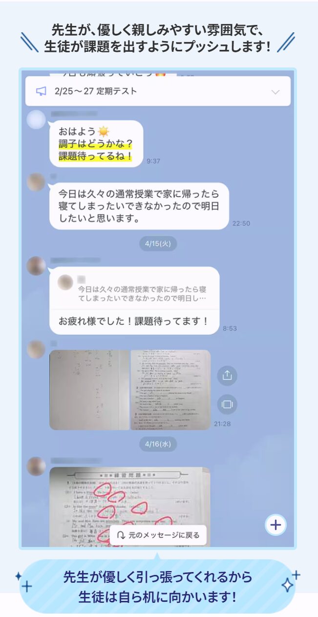 授業がない日でも、LINEでの進捗確認や宿題の提出・フィードバックが可能で、授業の時間以外でも勉強が習慣づけられる仕組みが整っています。