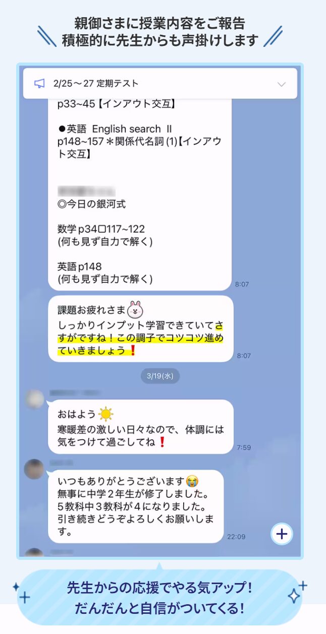 ↑LINEグループを通じて、親も子供の勉強の進捗状況がわかるので安心!